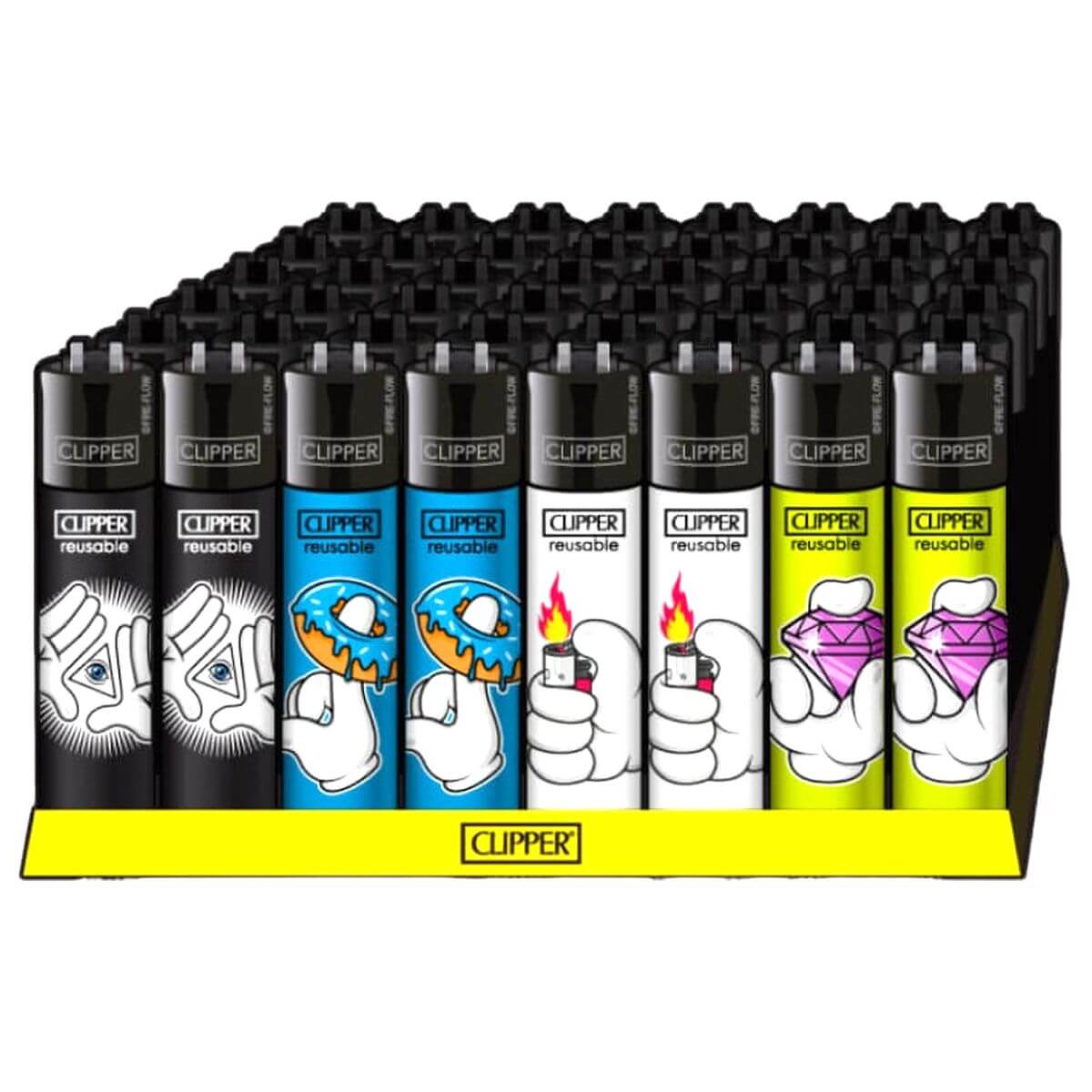 Il display da 48 pezzi di Clipper Classic Cartoon Hands #3 aggiunge un tocco audace e animato alla gamma di accendini ricaricabili di Clipper. Caratterizzato da espressivi disegni di mani in stile cartone animato, ogni accendino abbina immagini giocose al sistema ricaricabile affidabile di Clipper e alla pietra focaia sostituibile, garantendo prestazioni a lungo termine e sostenibilità. Perfetto per tabaccai, rivenditori di articoli lifestyle e distributori alla ricerca di design divertenti e da collezione con funzionalità affidabile.