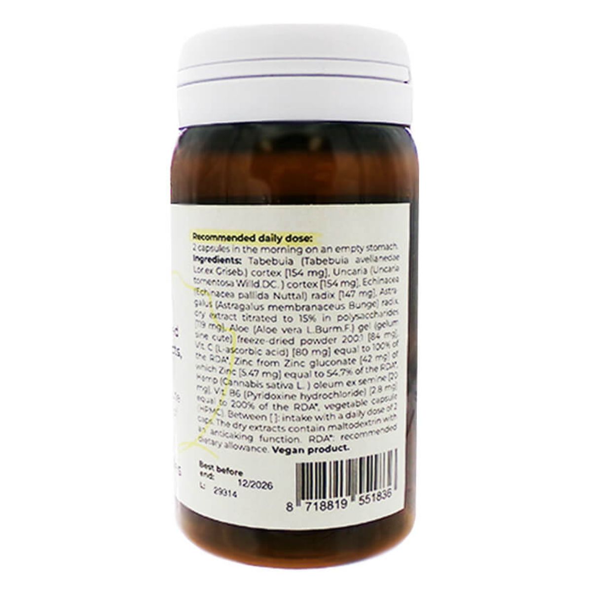 Ingredienti: Tabebuia (Tabebuia avellanedae Lor.ex Griseb.) corteccia [154 mg], Echinacea (Echinacea pallida Nuttal) radix [147 mg], Astragalo (Astragalus membranaceus Bunge) radix. Estratto secco titolato al 15% in polisaccaridi [119 mg], Aloe (Aloe vera L.Burm.F.) gel (gelum sine cute) polvere liofilizzata 200:1 [84 mg], Vit. C (acido L-assorbico) [80 mg] pari al 100% della RDA*, Zinco da Zinco gluconato [42 mg] di cui Zinco [5.47 mg] pari al 54,7% della RDA*, Canapa (Cannabis sativa L.) oleum ex semine [20 mg], Vit. B6 (Piridossina cloridrato) [2,8 mg] pari al 200% della RDA*, capsula vegetale (HPMC). Gli estratti secchi contengono maltodestrina con funzione antiagglomerante. RDA*: dose dietetica raccomandata. Prodotto vegano.